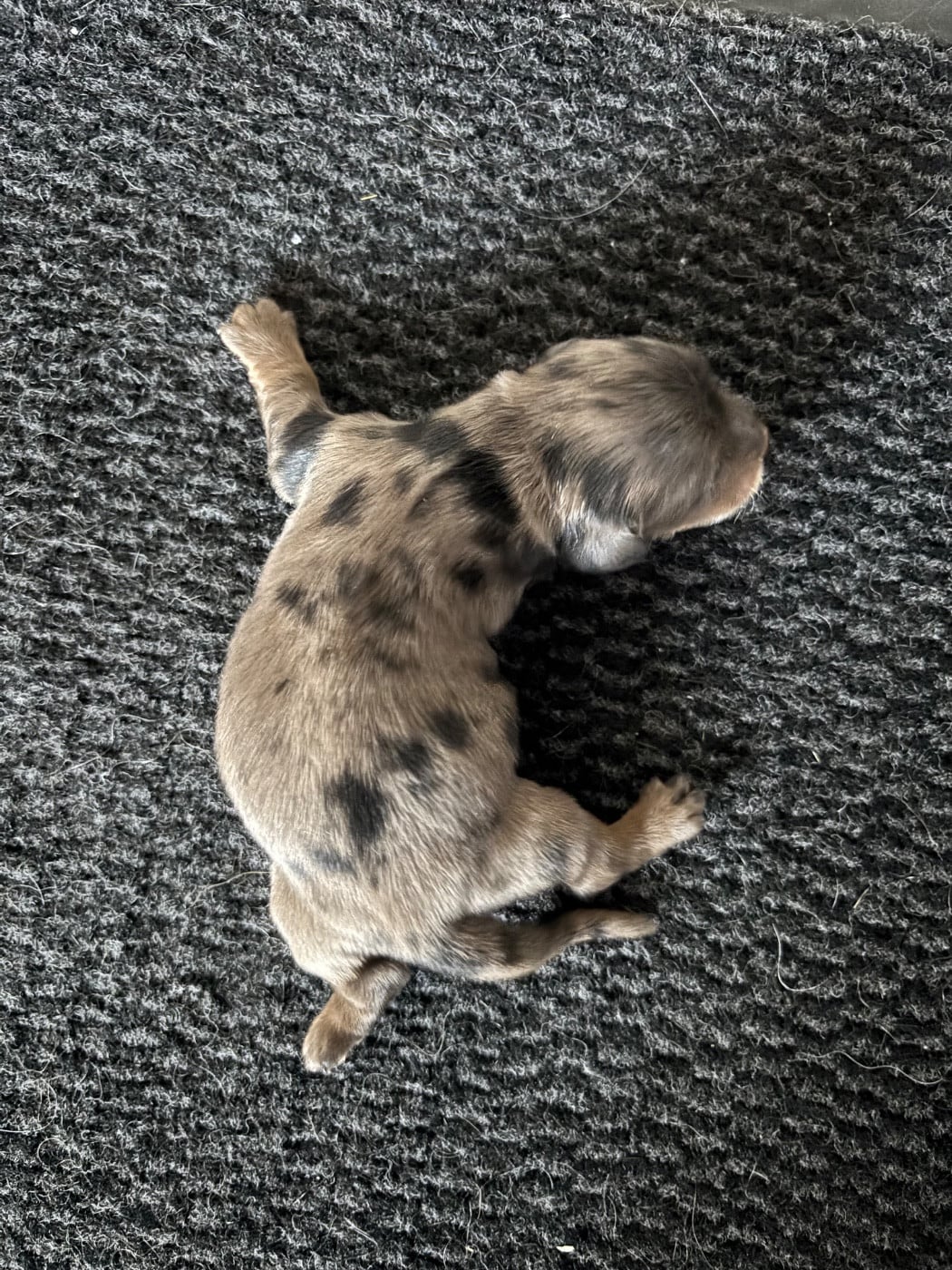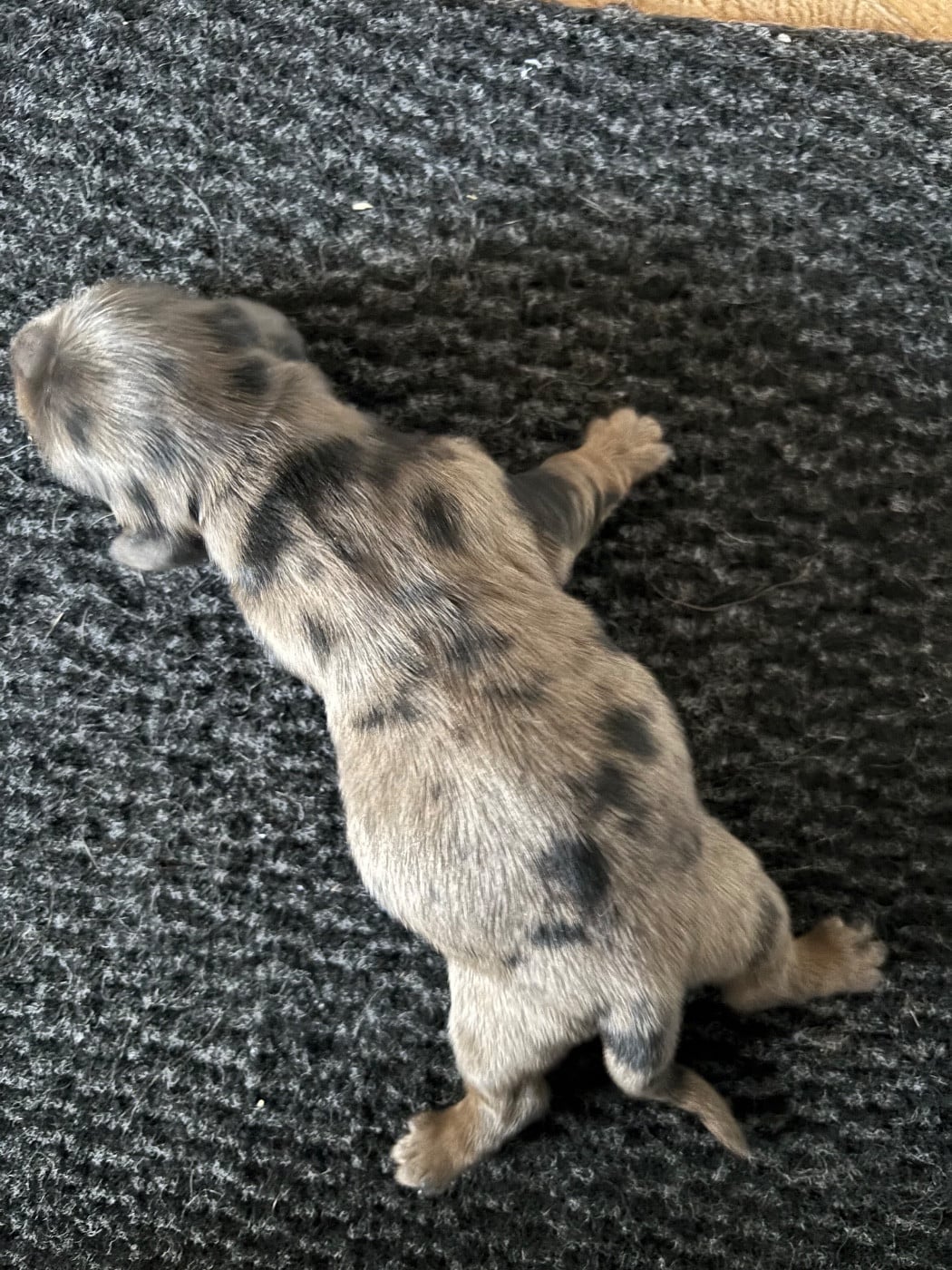 Ce 24 janvier à l’aube est née une jolie petite femelle teckel nain à poil long arlequine bleue .